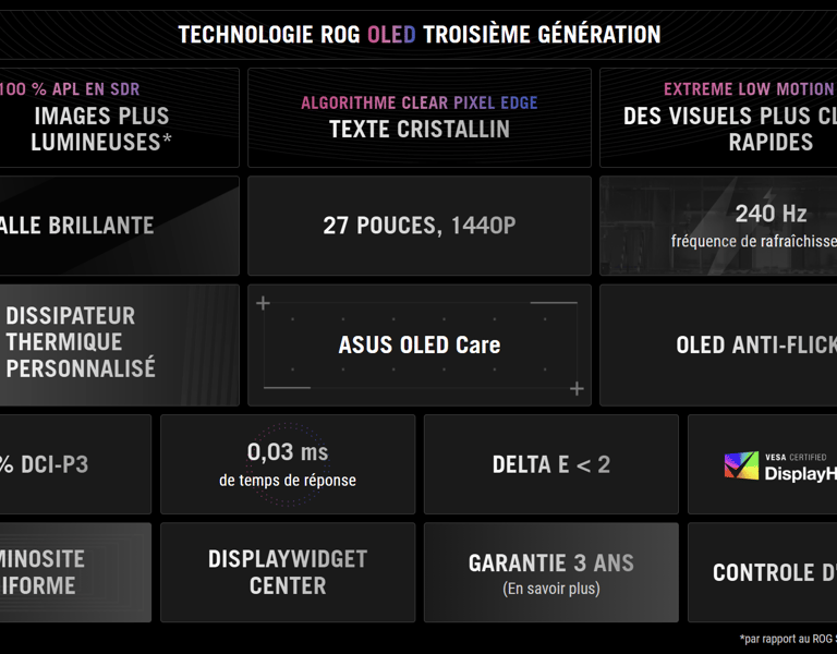 Sur une définition QHD de 2560 x 1440 pixels, nous avons donc une dalle de type WOLED d’une diagonale de 26,5″ pour un taux de rafraîchissement de 240 Hz et un temps de réponse de 0,03 ms.